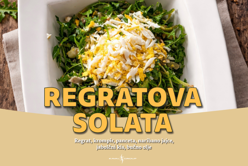 Prepustite se okusom pomladi s svežo regratovo solato, pripravljeno s sočnim krompirjem, hrustljavo panceto, naribanim jajcem ter prelivom iz jabolčnega kisa in bučnega olja.